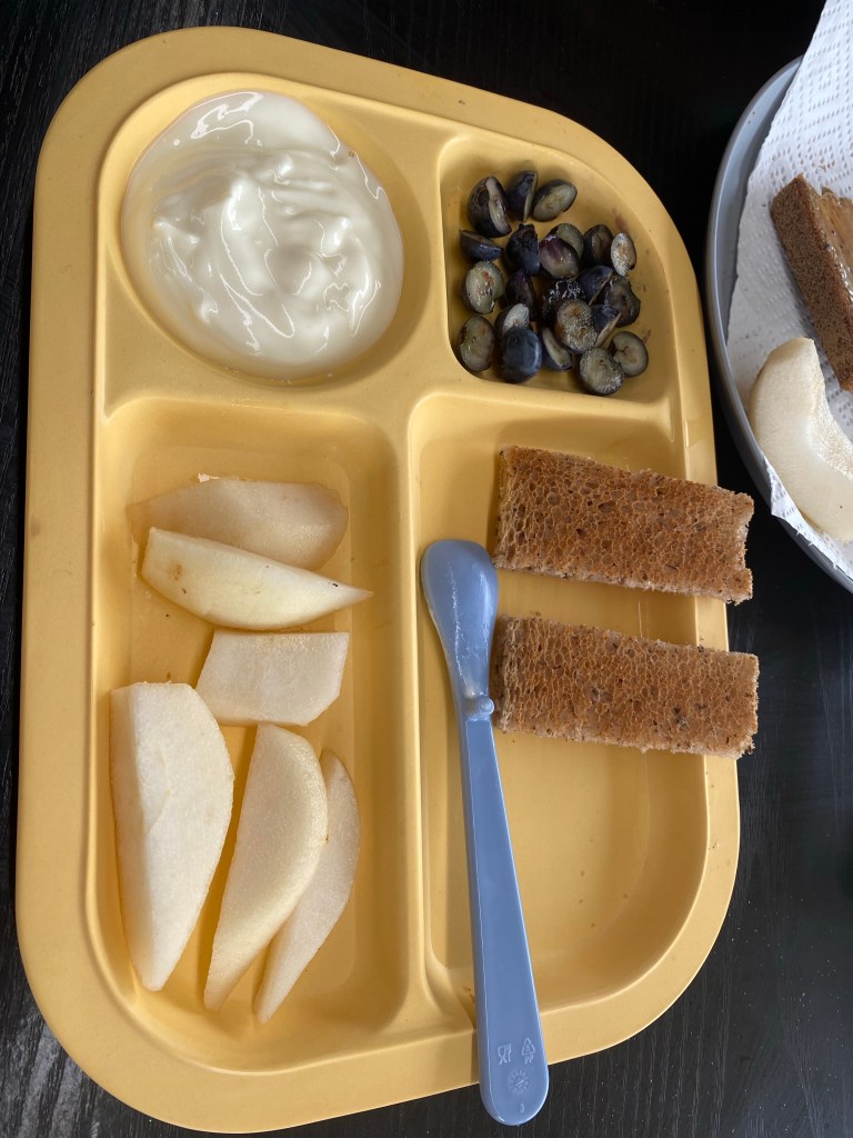 My little fella is ready for super ripe cut in half blueberries and after smashing the first one for fun, he started to eat them himself when served one at a time. I gave him three to see what he would do and he crushed them. As I expected, he ate all three gluten free toast fingers. When I took this pic I realised I hadn’t remembered to and he was already eating some toast. He ate most of this. He was very hungry because the day before he hadn’t eaten much due to teething.