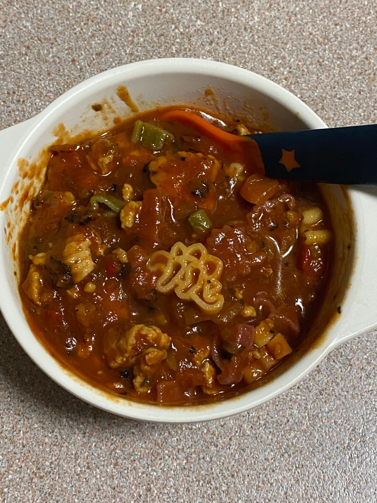 Using gluten free baby pasta sauce from Coles and gluten free pasta from Coles. I added a finely diced shallot onion bulb to an egg frying pan and sautéed until soft then added chicken mince which cooks fast. Added some Italian herbs a small pinch and cooked up some of the Dino pasta to combine. He liked it a lot. One thing I craved a lot was spaghetti. In any form. Spaghetti and Lasagna. This sauce is very good. I did have to add some water to reduce tartness. But not much.
