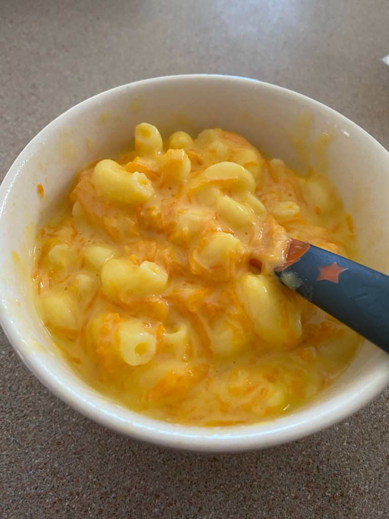 I cooked the pasta first in an egg pan and set it aside. Because I plan to refrigerate the meal I made extra sauce incase the pasta swells. I don’t want the meal to dry. Once pasta was cooked I put a small amount of butter and finely shredded carrot in the pan. Once cooked down and smelling fragrant and soft I added the slurry and some milk and stirred on a low to medium low heat until thickened. Then turning the heat off but keeping on the element I combined the pasta stirring gently and placed in a small ceramic bowl for reheating later.