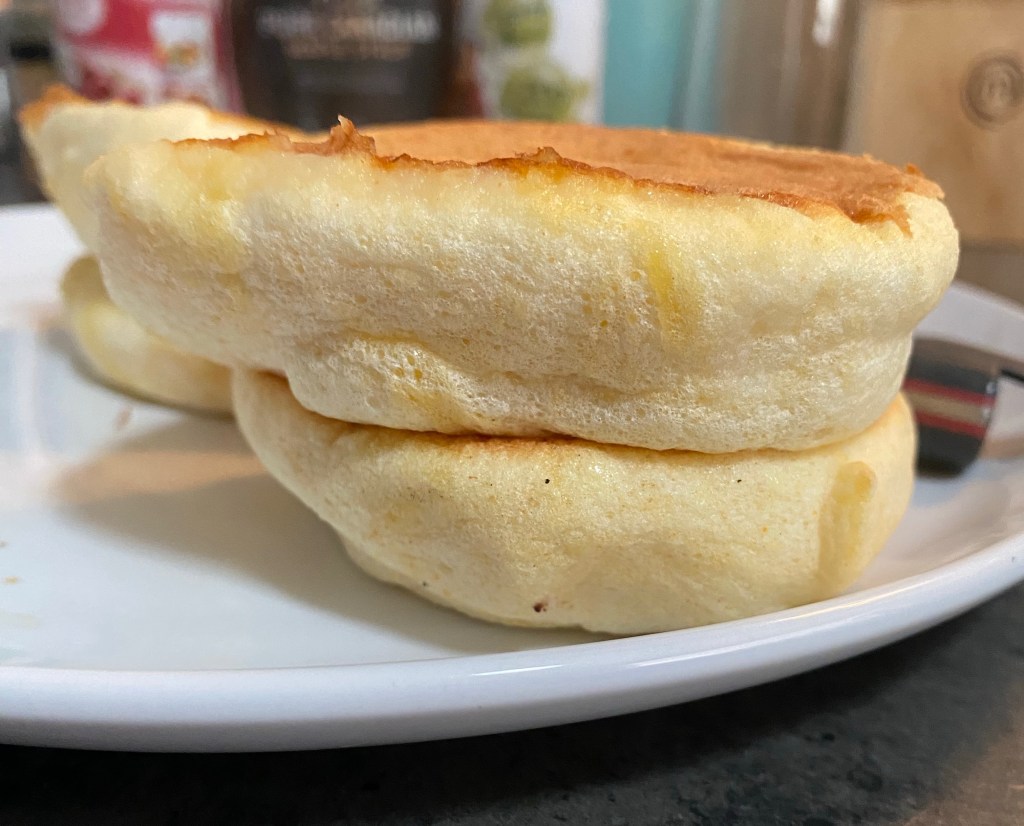 My toddler got one and loved it while hubby and I are the rest. They were lovely. First round, I did three. But they were so large they deflated a fair amount so the second round I made them smaller and added four in the pan. This is what I should have done. Then I had enough left for two so I did a big one and a smaller one. The smallest yet and though it deflated from sitting on the bench waiting to be cooked, the smaller pancake was the fluffiest and bounciest. And I do think it has a lot to do with the flour. Yes you can is quite dense and heavy. I would love to try this with Well & Good plain flour next.
