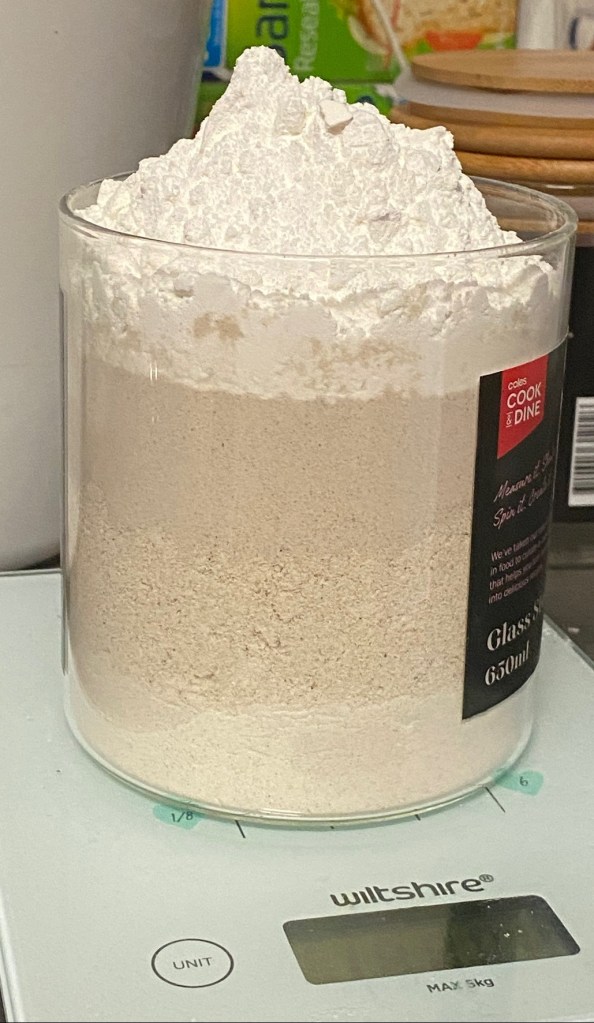 I made a mixed gluten free flour blend of buckwheat flour, sorghum flour, green banana flour and glutenous rice flour (despite name, has no gluten). I did them all at 100 grams