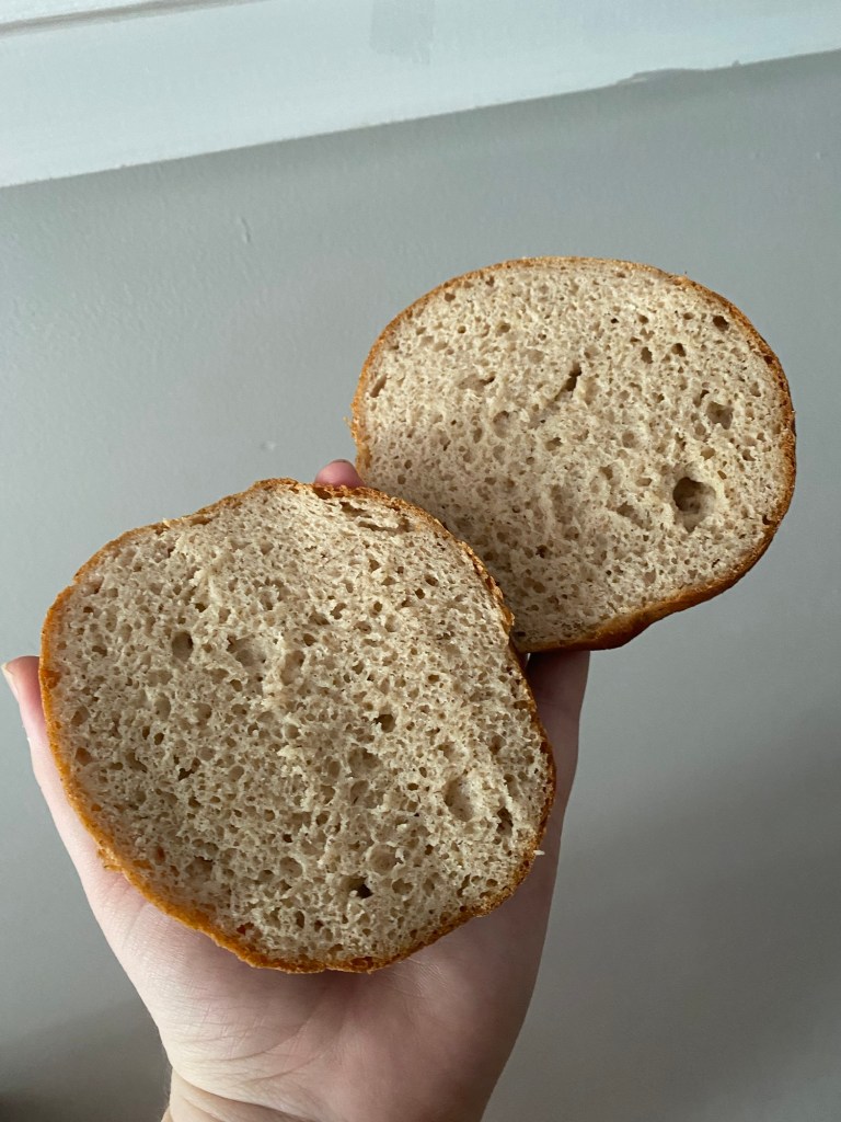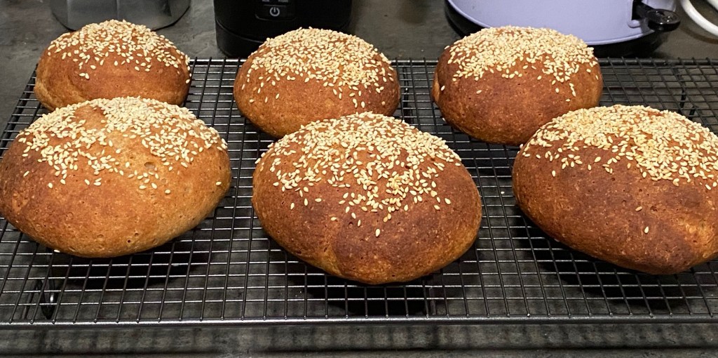 I baked my bun until a darker brown. The crust isn’t too chewy. It has a nice bread feel too it and a good flavour. The crust in this recipe is not crunchy, making it a good burger bun.