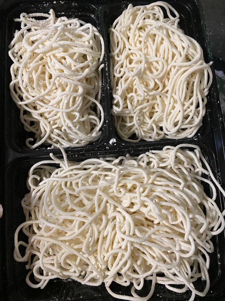 Here is the noodles freshly cooked. Because of the starch they MUST be chilled after cooking. After they’re boiled rinse under cold water and transfer to a bowl of cold to ice cold water until ready to use in your recipe. These white noodles don’t actually swell much after being chilled and can keep their strength to the end of the dish.